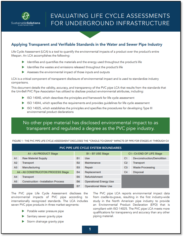 Sustainable Solutions Corporation (SSC) paper on the importance of using transparent and verifiable standards when determining the environmental impacts of a pipe product. No other pipe material has disclosed environmental impacts to as transparent and regulated a degree as the PVC pipe industry.